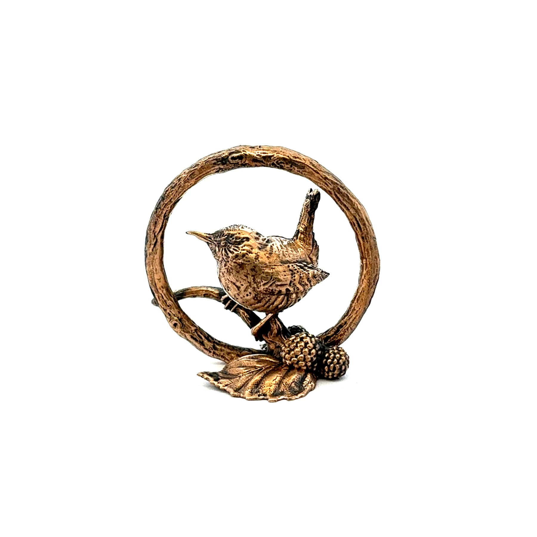 Cast in solid bronze, the wren is delicately perched on a textured twig, finished with sculpted blackberries and a single leaf. Fine feather detailing and organic textures celebrate the wren’s symbolism of joy, resilience, and protection.