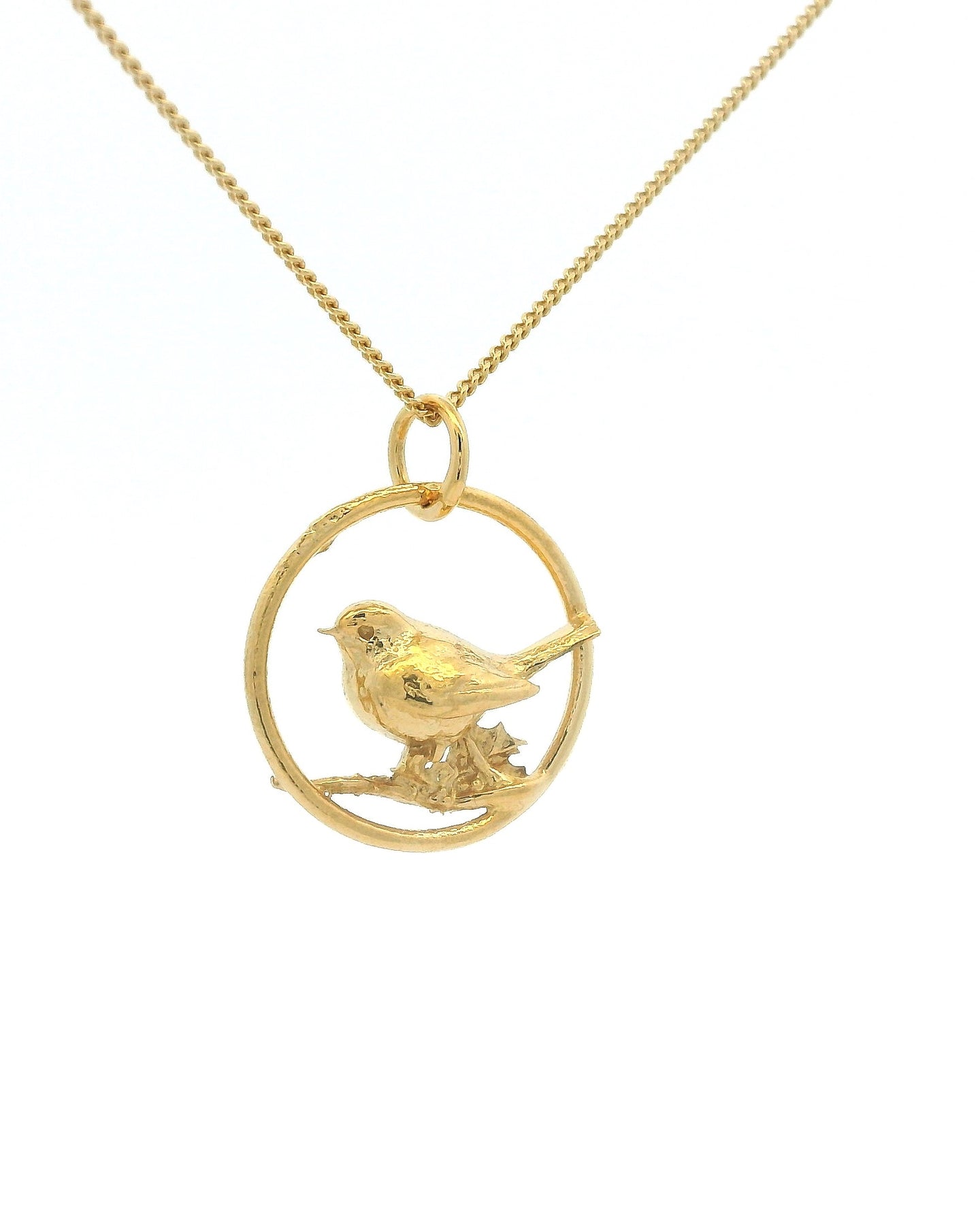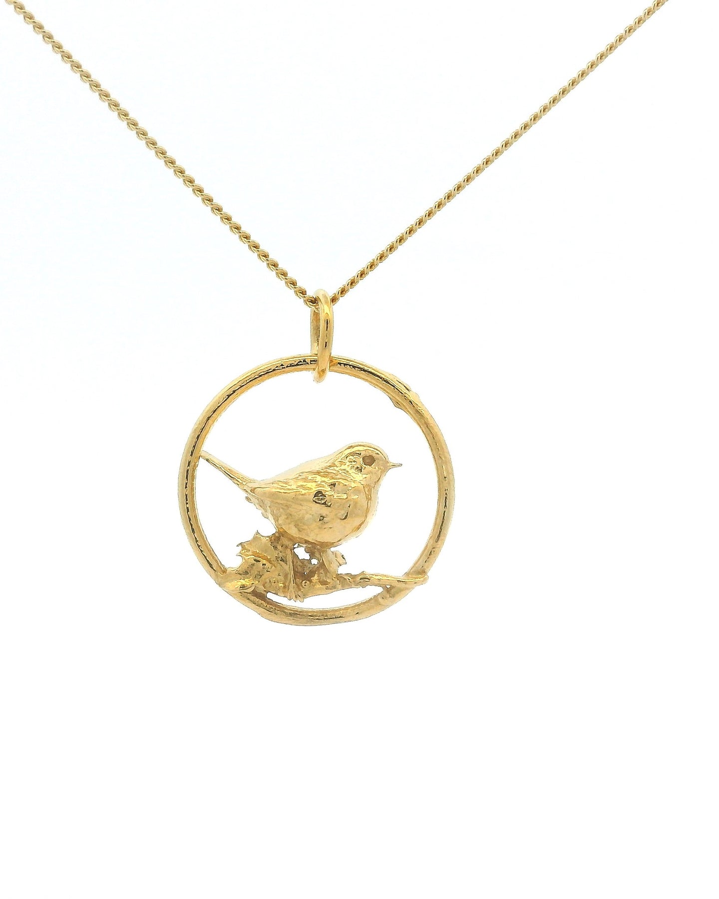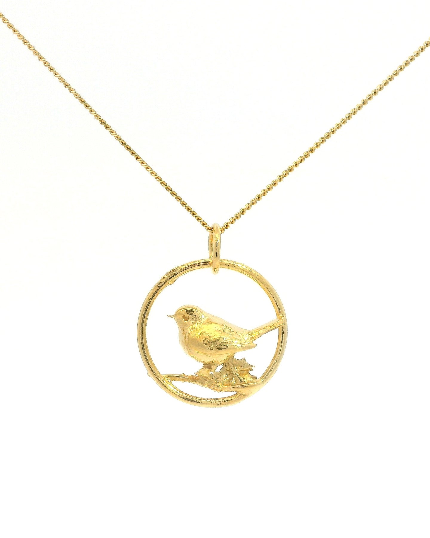 Blackbird Jewellery Gold vermeil robin necklace in hoop on a fine chain – handmade bird jewellery supporting the RSPB