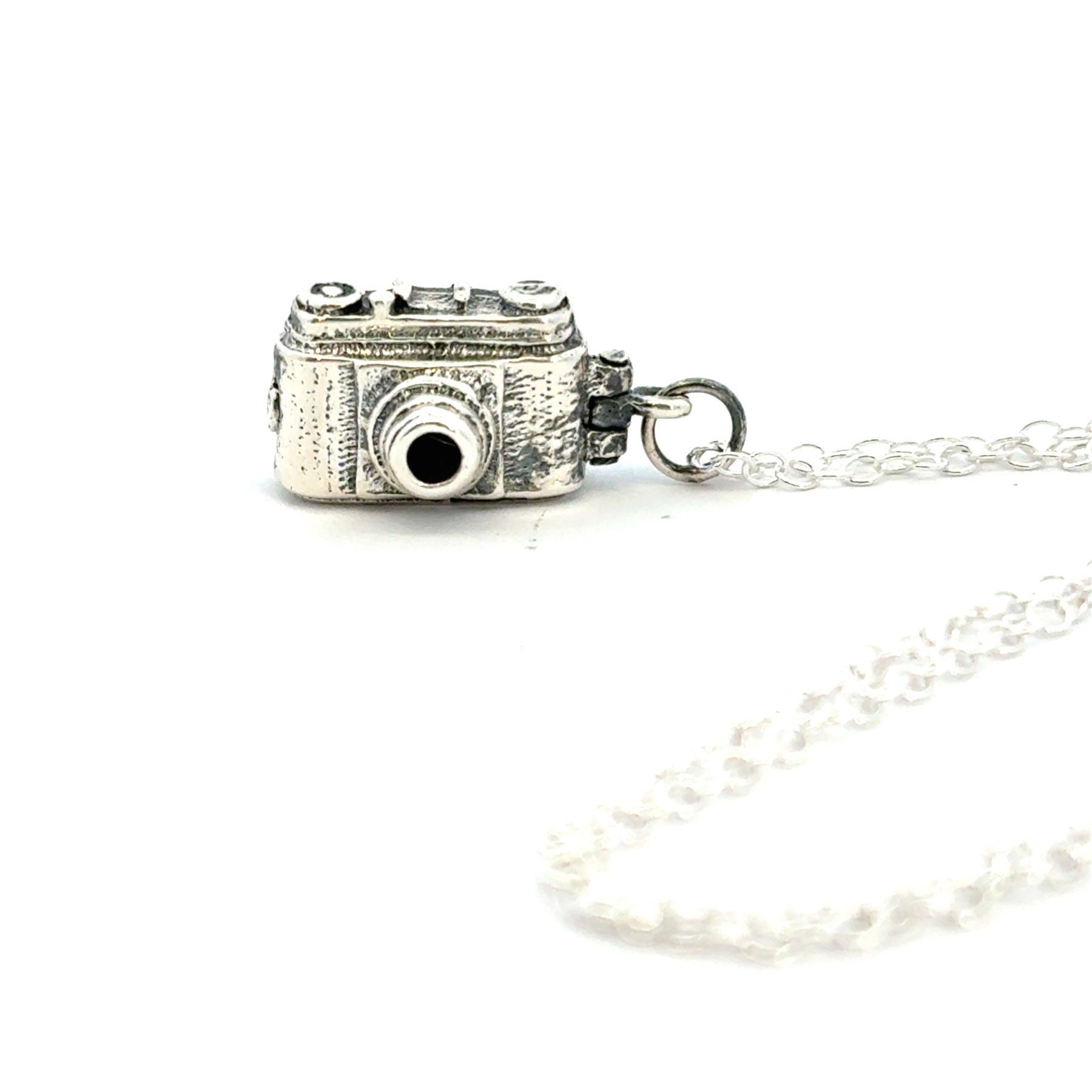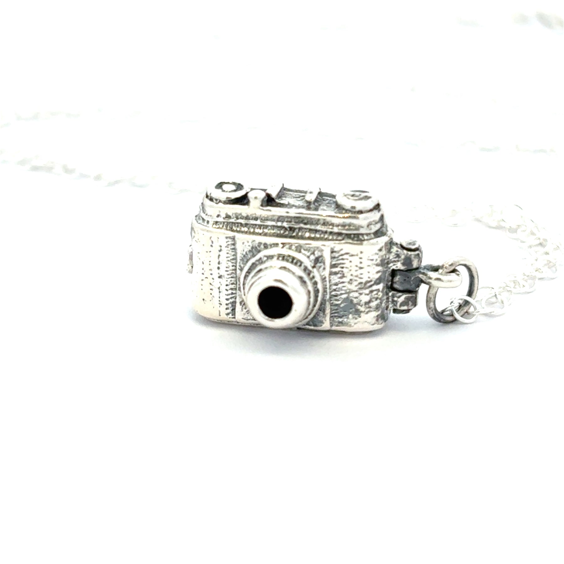 Sterling silver vintage camera necklace on a chain, handcrafted from recycled silver with oxidised detail on a white background